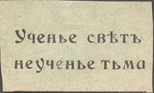 1915(?) г. Разм. 52 х 32 мм. Одноцветная печать на серо-зеленоватой бумаге. В центре в две строки: «Ученье свет неученье тьма».