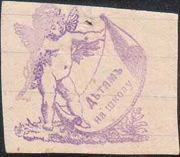 1915(?) г. Разм. 43 х 36 мм. Одноцветная печать на белой тетрадной бумаге в линейку. На лицевой стороне фиолетовый оттиск ручного штампа. На штампе ангел держит картуш с текстом в две строки: «Детям на школу».
