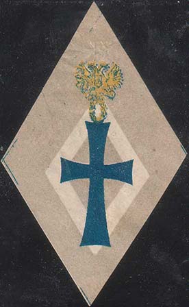 1917 г. 22.-23.10.1917 г. Ромб разм. 47 х 76 мм. Трехцветная печать на белой бумаге. В центре знак выпускника университета. Орел на знаке без царских регалий. По углам ромба разграничительные линии.