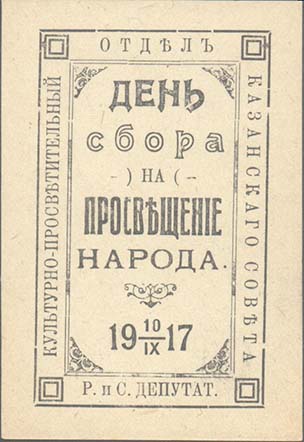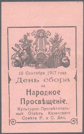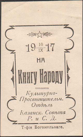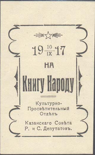 1917 г. 10.11.1917 г. Разм. 54 х 87 мм. Одноцветная печать на бумаге различных цветов. В двойной прямоугольной рамке разм. 45 х 64 мм сверху текст в четыре строки: «Граждане! Жертвуйте на Книгу Народу». Внизу текст в пять строк мелким шрифтом: «Культурно-Просветительный Отдел Казанского Совета Р[а…