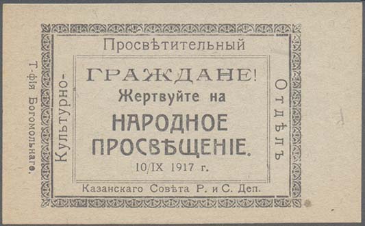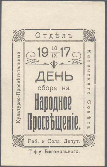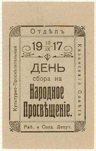 1917 г. 10.11.1917 г. Разм. и рис. аналогичны предыдущему выпуску. Внизу текст в пять строк: «Культурно-Просветительн[ый]. Отдел Казанск[ого]. Совета Р[абочих]. и С[олдатских]. Д[епутатов].». Внизу под рамкой выходные данные: «Т-фия Богомольнаго».