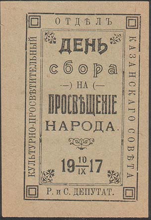 1917 г. 10.11.1917 г. Разм. 52 х 73 мм. Одноцветная печать на бумаге различных цветов. В двойной прямоугольной рамке с декоративными элементами по углам разм. 39 х 63 мм сверху текст в пять строк: «День сбора на просвещение народа». Внизу дата: «19 10/IX 17». По периметру между рамками текст: «Кул…
