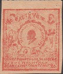 1929 г. Разм. рамки 30 х 48 мм. Одноцветная печать на бумаге различных цветов. Зубц. 11 1/2. В двойной прямоугольной рамке стилизованная аббревиатура «ОДН». Буква «Д» в виде радиомачты. Ниже номинал. Внизу текст в две строки: «Помоги в борьбе с неграмотностью».