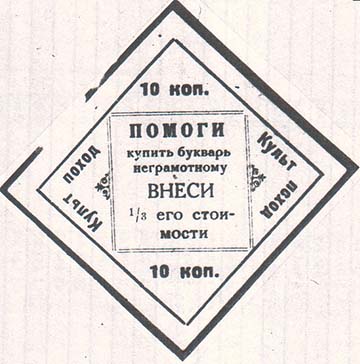 1928 г. Ромб разм. 69 х 69 мм. Одноцветная печать на бумаге различных цветов. В рамке в форме ромба разм. 57 х 57 мм вписана двойня прямо-угольная рамка. В центре прямоугольной рамке текст в шесть строк: «Помоги купить букварь неграмотному. Внеси 1/3 его стоимости». По периметру между рамками дв…