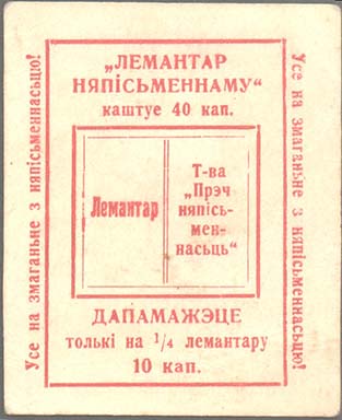 1931 г. Разм. 49 х 68 мм. Одноцветная печать на желтоватой бумаге. В центре в прямоугольной рамке разм. 38 х 54 мм стилизованной изображение раскрытой книги, на развороте которой текст на белорусском языке: «Букварь. О-во долой неграмотность». Сверху текст в три строки на белорусском языке: «Букв…
