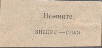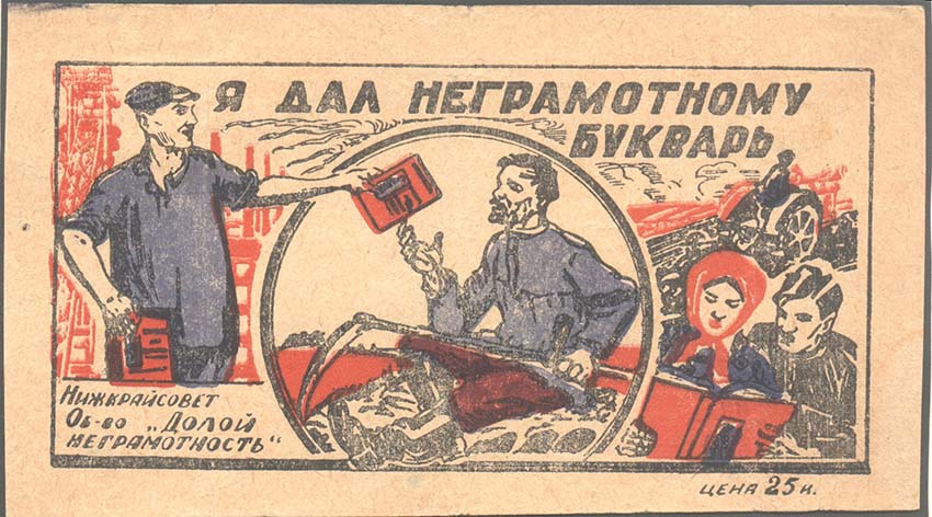 1931(?) г. Листок разм. 141 х 78 мм. Трехцветная печать на желтоватой бумаге. В прямоугольной рамке разм. 126 х 62 мм в центре рабочий протягивает крестьянину букварь. На заднем плане индустриальный и сельский пейзажи. В правом нижнем углу мужчина и женщина читают букварь. Сверху текст в две стро…