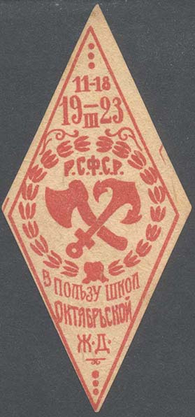 1923 г. 11.-18.03.1923 г. Ромб разм. рамки 42 х 95 мм. Одноцветная печать на рыхлой желтоватой бумаге. В центре в обрамлении венка скрещенные топор и якорь. Сверху аббревиатура «Р.С.Ф.С.Р.». Сверху в две строки дата: «11-18 19-23/III». Внизу текст в две строки: «В пользу школ Октябрьской Ж.Д.».