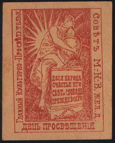 1917(?) г. Разм. рамки 57 х 69 мм. Одноцветная печать на толстой желтоватой бумаге. В центре аллегорический рисунок. Текст в четыре строки: «Доля народа счастье его свет и свобода прежде всего». По периметру рамки текст: «Главный Культурно-Просветительн[ый]. Совет М.-К-.В. Жел. Д. День просвещени…