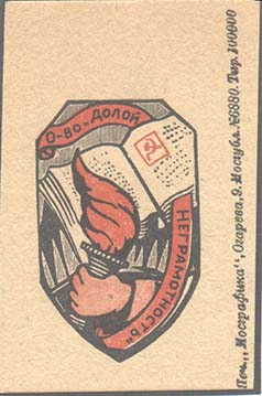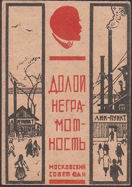 1930 г. 01.11.1930 г. Разм. 43 х 61 мм. Двухцветная печать на толстой желтоватой бумаге. В центре сверху профиль В.И.Ленина. В центре текст в четыре строки: «Долой неграмотность». Внизу текст в две строки: «Московский совет ОДН». Слева в прямоугольной рамке лик-пункт в деревне. Справа в прямоуголь…
