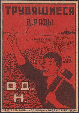 1930(?) г. Разм. рамки 40,5 х 53 мм. Двухцветная печать на толстой желтоватой бумаге. В центре в прямоугольной рамке рабочий с поднятой вверх правой рукой и молотом в левой. На заднем фоне демонстрация на фоне завода и восходящего солнца. Сверху текст в четыре строки: «Трудящиеся в ряды О.Д.Н.». …