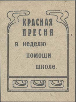1930(?) г. Разм. 44 х 59 мм. Одноцветная печать на серо-зеленой бумаге. В центре в фигурной рамке разм. 36 х 47 мм текст в пять строк: «Красная Пресня в неделю помощи школе».