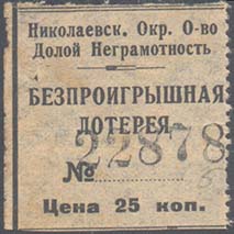 1930(?) г. Разм. по перфорации 35 х 35 мм. Одноцветная печать на тонкой серой бумаге. Правосторонняя нерегулярная зубц. В центре текст в три строки: «Безпроигрышная лотерея №... (номер нумератором)». Сверху текст в две строки: «Николаевск[ое]. Окр[ужное]. О-во Долой Неграмотность». Внизу номинал:…