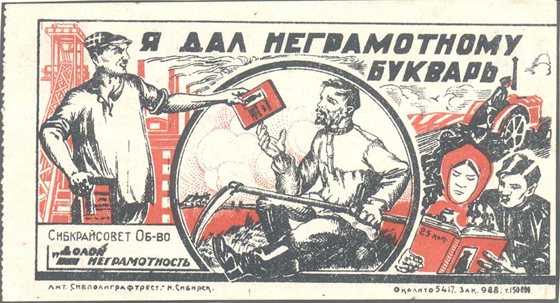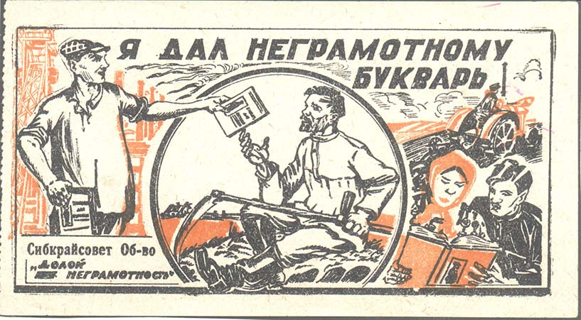1932 г. Листок разм. 138 х 74 мм. Двухцветная печать на плотной белой бумаге. Левосторонняя зубц. 11 1/2. В прямоугольной рамке разм. 127 х 63 мм в центре рабочий протягивает крестьянину букварь. На заднем плане индустриальный и сельский пейзажи. В правом нижнем углу мужчина и женщина читают букв…