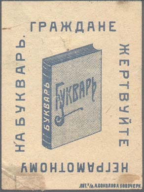 1918(?) г. Разм. 48 х 64 мм. Одноцветная печать на желто-ватой бумаге. В центре книга с надписью на корешке и на обложке: «Букварь». По периметру текст: «Граждане жертвуйте неграмотному на букварь». Справа внизу выходные данные мелким шрифтом: «Лит. Т/д. А. Соколова, Новочерк[асск].».