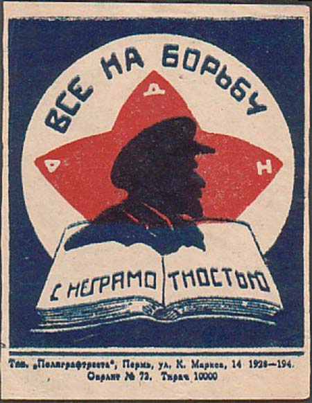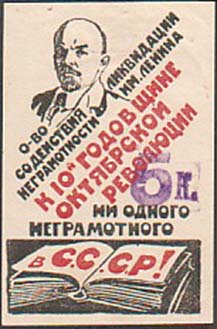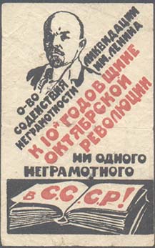 1925 г. Разм. 36 х 57 мм. Двухцветная печать на тонкой белой бумаге. В левом верхнем углу портрет В.И.Ленина. В центре по диагонали текст в восемь строк: «О-во содействия ликвидации не-грамотности им. Ленина к 10-й годовщине Октябрьской революции ни одного неграмотного». Внизу на сплошном фоне от…