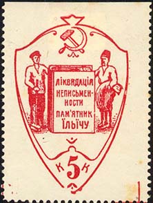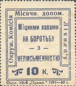 1931 г. Сентябрь. Разм. по перфорации 33 х 50 мм. Одноцветная печать на белой бумаге. В фигурной рамке в форме щитка разм. 28 х 45 мм в центре рабочий и крестьянин держат большую книгу. На обложке книги текст в пять строк на украинском языке: «Ликвидация неграмотности памятник Ильичу». Сверху серп…