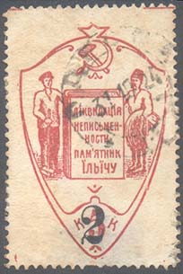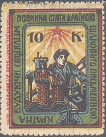 1931 г. Разм. рамки 31 х 40,5 мм. Многоцветная печать на тетрадной бумаге в клеточку. Нерегулярная зубц. В центре в двойной прямоугольной рамке рабочий на фоне индустриального пейзажа. Сверху пятиконечная звезда с лучами и номинал. По периметру между рамками текст на украинском языке: «Страна стр…