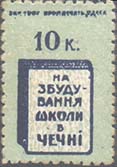 1931 г. Разм. по перфорации 20 х 27 мм. Двухцветная печать на белой мелованной бумаге. Зубц. 11 1/2. В центре на сплошном фоне книга, на обложке которой текст на украинском языке в шесть строк: «На организацию школы в Чечне». Над книгой номинал. Внизу мелким шрифтом выходные данные мелким шрифтом…