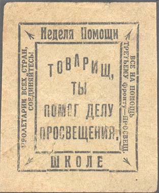 1922 г. 30.11.1922 г. Разм. 52 х 63 мм. Одноцветная печать на тонкой желто-коричневой бумаге. В центре в двойной прямоугольной рамке разм. 40 х 49 мм текст в четыре строки: «Товарищ, ты помог делу просвещения». По периметру между рамками текст: «Неделя помощи школе. Пролетарии всех стран соединяйт…