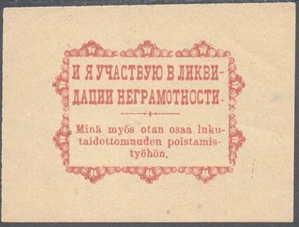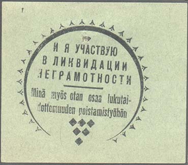 1930(?) г. Разм. 62 х 54 мм. Одноцветная печать на светло-зеленой бумаге. В центре в рамке в виде неполного круга с декоративными элементами текст в три строки: «И я участвую в ликвидации неграмотности». Внизу под чертой текст в две строки на местном языке. Внизу декоративные элементы в виде ромб…