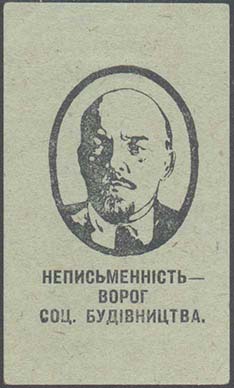 1932(?) г. Разм. 38 х 65 мм. Одноцветная печать на бумаге различных цветов. В центре в овале портрет В.И.Ленина. Внизу текст в три строки на украинском языке: «Неграмотность – враг соц[иалистического]. строительства».