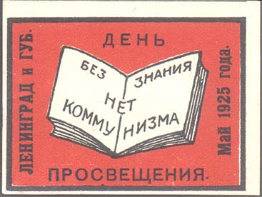 1925 г. 31.05.1925 г. Разм. рамки 56 х 41 мм. Двухцветная печать на плотной белой бумаге. В центре в прямоугольной рамке раскрытая книга, на развороте которой текст в три строки: «Без знания нет коммунизма». По внутреннему периметру рамки текст: «Ленинград и губ[ерния]. День просвещения. Май 1925 …