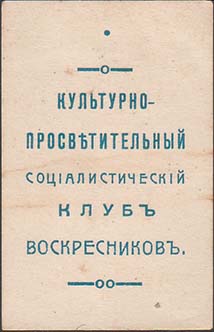 1917 г. 29.08.1917 г. Разм. 36 х 55 мм. Одноцветная печать на плотной белой бумаге. В центре текст в пять строк: «Культурно-просветительный социалистический клуб воскресников». Сверху и снизу декоративные элементы. Сверху точка для прокола булавкой.