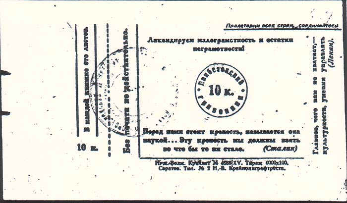 1931 г. Листок из квитанционной книжки с корешком разм. 150 х 87 мм. Одноцветная печать на желтоватой бумаге. Справа в центре в круглой рамке диаметром 23 мм номинал: «10 к.». По периметру рамке текст: «Ликбезовский гривенник». Сверху тест в две строки: «Ликвидируем малограмотность и остатки не-г…