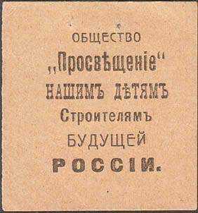 1919 г. Разм. 47 х 50 мм. Одноцветная печать на плотной желто-серой бумаге. В центре текст в шесть строк: «Общество «Просвещение» нашим детям строителям будущей России».