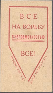 1927(?) г. Разм. рамки 31 х 46 мм. Двухцветная печать на желтоватой бумаге с мелованным верхним слоем. В прямоугольной рамке на фоне, стилизованном под прописи в центре прописные буквы «А», «Б» и «В». Сверху текст в две строки: «Ученье свет,». Внизу продолжение текста в две строки: «а неученье ть…