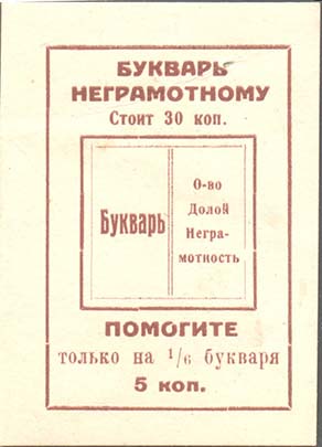 1931 г. Разм. 49 х 68 мм. Одноцветная печать на бумаге различных цветов. В центре в прямоугольной рамке разм. 38 х 54 мм стилизованной изображение раскрытой книги, на развороте которой текст: «Букварь. О-во долой неграмотность». Сверху текст в три строки: «Букварь неграмотному стоит 30 коп.». Вни…