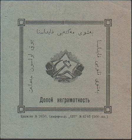 1931(?) г. Разм. 77 х 80 мм. Одноцветная печать на серо-синей бумаге. В прямоугольной рамке разм. 52 х 52 мм с декоративными элементами по углам серп и молот на фоне пятиконечной звезды. По периметру текст на татарском языке арабским шрифтом. Внизу текст: «Долой неграмотность». Внизу под рамкой м…