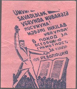 1931 г. Разм. 44 х 51 мм. Одноцветная печать на тонкой светло-розовой бумаге. В центре фигура рабочего, указывающая левой рукой на раскрытую книгу, правая рука поднята вверх. На заднем плане толпа людей. Сверху текст в шесть строк на татарском языке латинским шрифтом. Ниже текст в четыре строки: …