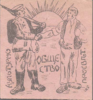 1917 г. Разм. 65 х 70 мм. Одноцветная печать на розово-серой бумаге. В центре на фоне восходящего солнца крестьянин и солдат с винтовкой на плече пожимают друг другу руки. Текст в две строки: «Культурно-просветит[ительное]. общество». В правом нижнем углу буквы «М.Б.».