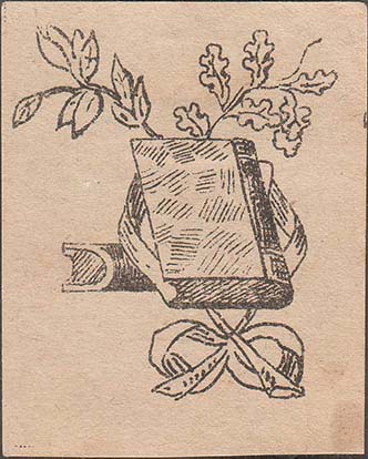 1916(?) г. Разм. 56 х 69 мм. Одноцветная печать на серо-зеленоватой бумаге. В центре две книги, лавровая и дубовая ветвь, перевитые лентой.