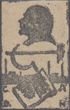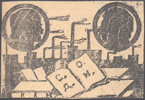 1925(?) г. Разм. 81 х 56 мм. Одноцветная печать низкого качества на бумаге различных цветов. Сверху по углам в круглых рамках диаметром 28 мм профили В.И.Ленина и И.В.Сталина. Внизу на фоне индустриального пейзажа открытая книга с аббревиатурой «С.О.Д.Н. на страницах».