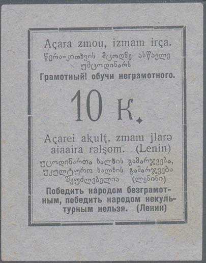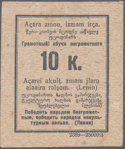 1931 г. Разм. рамки 63 х 57 мм. Одноцветная печать на желтоватой бумаге низкого качества. В двойной прямоугольной рамке разм. 52 х 66 мм в центре номинал. Сверху текст на русском, грузинском и абхазском языках: «Грамотный! Обучи неграмотного». Внизу текст на русском, грузинском и абхазском языках…