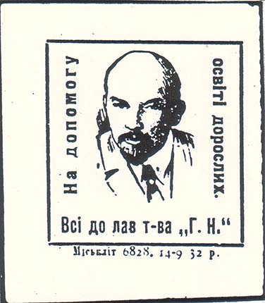 1932 г. 14.09.1931 г. Разм. рамки 45 х 46 мм. Одноцветная печать на белой бумаге. В центре в прямоугольной рамке портрет В.И.Ленина. По периметру текст на украинском языке: «На помощь обучения взрослых. Все в ряды о-ва «ОДН»». Внизу под рамкой мелким шрифтом выходные данные на украинском языке: «Г…