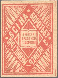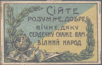 1918(?) г. Разм. рамки 61 х 39 мм. Многоцветная печать на желтоватой бумаге. Поле в прямоугольной рамке по диагонали поделено на две части цветов украинского флага. В обрамлении венка из лавровых листьев в левом нижнем углу глобус и книги. Справа текст на украинском языке в пять строк: «Сейте раз…