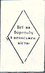 1932(?) г. Разм. 38 х 62 мм. Одноцветная печать на белой бумаге. В центре в рамке в форме ромба разм. 28 х 49 мм текст в четыре строки на украинском языке: «Все на борьбу с неграмотностью».