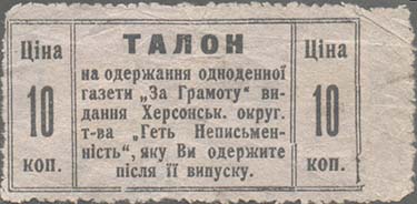 1930 г. Разм. рамки 54 х 26 мм. Одноцветная печать на тонкой серо-зеленой бумаге. Нерегулярная зубц. В двойной прямоугольной рамке в центре текст в семь строк: «Талон на получение однодневной газеты «За Грамоту» выпуска Херсонск[ого]. Окружн[ого]. О-ва «Долой неграмотность», которую Вы получите п…