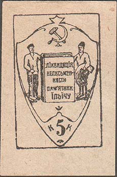 1932 г. Разм. 38 х 58 мм. Одноцветная печать на бумаге различных цветов. В прямоугольной рамке разм. 29 х 44 мм дополнительная фигурная рамка в форме щитка. В центре фигурной рамки рабочий и крестьянин держат большую книгу. На обложке книги текст в пять строк на украинском языке: «Ликвидация негр…