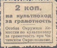1930(?) г. Разм. рамки 29 х 24 мм. Одноцветная печать на кремовой бумаге. Зубц. 11 1/2. В прямоугольной рамке сверху текст в три строки: «2 коп. на культпоход за грамотность». Внизу текст в четыре строки: «Особая Окружная Комиссия по культпоходу за грамотность при Читинском Окрисполкоме».