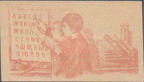 1917 г. 28.10.1917 г. Разм. 80 х 46 мм. Одноцветная печать на тонкой желто-серой бумаге. В центре двое детей указывающих руками на плакат с русским алфавитом. Внизу чернильница с пером. Справа стол с книгами.