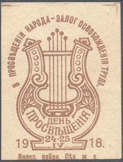 1918 г. 24.-25.04.1918 г. Разм. 42 х 56 мм. Одноцветная печать на плотной желтоватой бумаге. В центре в декоративной рамке в виде лиры внизу текст в четыре строки: «День просвещения 24-25 IV 1918». Сверху полукругом текст: «В просвещении народа – залог освобождения труда». Внизу текст: «Яросл[авск…