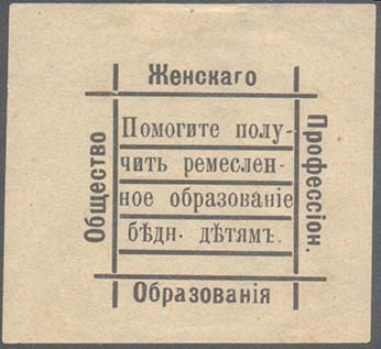1917(?) г. Разм. 56 х 52 мм. Одноцветная печать на тонкой желтоватой бумаге. В центре в прямоугольной рамке разм. 28,5 х 28,5 мм текст в четыре строки: «Помогите получить ремесленное образование бедн[ым]. детям». По внешнему пери-метру текст: «Общество Женского Професси-он[ального]. Образования».