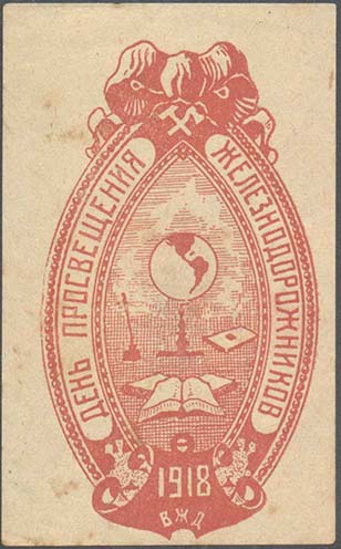 1918 г. Разм. рис. 42 х 75 мм. Одноцветная печать на желтоватой бумаге. В центре в рамке сложной формы глобус, чернильница с пером, тетради и книги. Сверху железнодорожная эмблема. Внизу на картуше текст в две строки: «1918 В.Ж.Д.». По периметру рамки текст: «День просвещения железнодорожников».