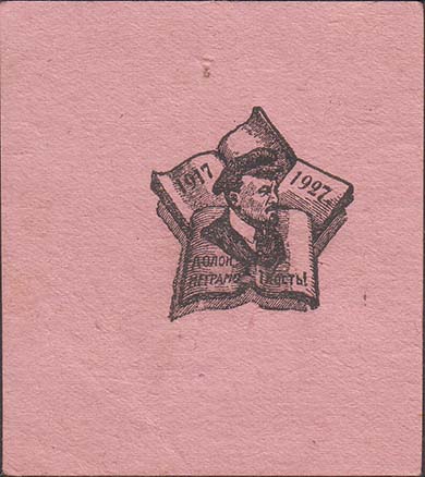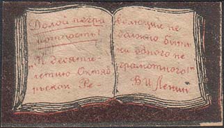 1925(?) г. Разм. 53 х 30 мм. Двухцветная печать на тонкой белой бумаге. В центре на сплошном фоне раскрытая книга, на страницах которой текст в пять строк: «Долой неграмотность! «К десятилетию Октябрьской Революции не должно быть ни одного неграмотного! В.И.Ленин».