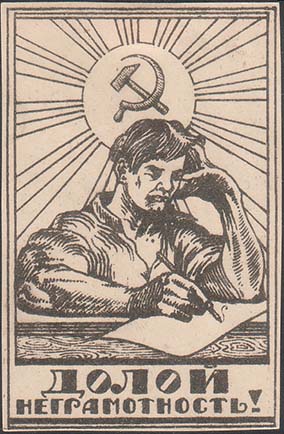 1925(?) г. Разм. рамки 45 х 71 мм. Одноцветная и двухцветная печать на белой бумаге. В центре в двойной прямоугольной рамке рабочий, пишущий на листе бумаги, сидя за столом на фоне лучей восходящего солнца. На солнце в центре серп и молот. Внизу текст в две строки: «Долой неграмотность!».
