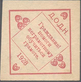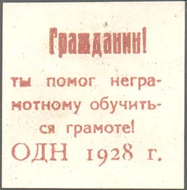 1928 г. Разм. 44 х 44 мм. Одноцветная печать гладкой белой бумаге. В центре текст в пять строк: «Гражданин! Ты помог неграмотному обучиться грамоте! ОДН 1928 г.».
